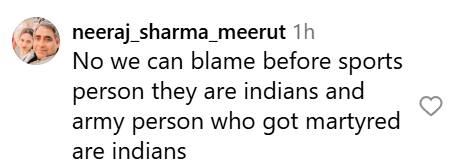 एक शख्स ने कहा- कोई भी स्पोर्ट्समैन पहले भारतीय है. इसके अलावा एक यूजर ने कमेंट किया- नहीं, हम खिलाड़ियों को दोष नहीं दे सकते, वो भारतीय हैं और शहीद हुए सेना के जवान भी भारतीय हैं.