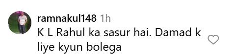 सुनील शेट्टी के इस बयान पर अब नेटिजन्स उन्हें ट्रोल कर रहे हैं. एक शख्स ने एक्टर के क्रिकेटर दामाद केएल राहुल के हवाले से लिखा- दामाद ड्रॉप ना हो जाए. दूसरे ने कमेंट किया- केएल राहुल का ससुर है, दामाद के लिए क्यों बोलेगा.' एक ने कहा- 'कोई खास ड्रॉप ना हो जाए. उसकी टेंशन भी है.'