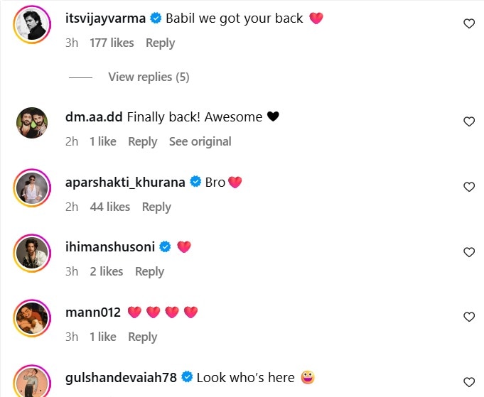 बाबिल खान का ऐसा इमोशनल पोस्ट देखते हुए कई सेलेब्स भी उनके स्पोर्ट में नजर आ रहे हैं. विजय वर्मा, अपारशक्ति खुराना और गुलशन देवियाह जैसे स्टार्स ने कॉमेंट कर अपना स्पोर्ट दिखाया है. साथ ही बॉलीवुड स्टार्स के अलावा फैंस भी बाबिल खान के सोशल मीडिया वापसी पर अपनी खुशी जाहिर कर रहे हैं.