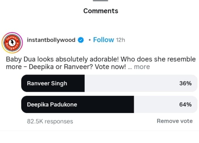 इस मजेदार पोल के नतीजों के मुताबिक, 64% फैंस का मानना है कि दुआ बिल्कुल अपनी मां दीपिका की तरह दिखती हैं, जबकि 34% लोगों को लगता है कि वह रणवीर की कॉपी हैं. वहीं, कई यूजर्स ने कमेंट सेक्शन में लिखा कि दुआ में दोनों की झलक साफ नजर आती है उसकी मुस्कान दीपिका जैसी है तो आंखों में रणवीर की चमक दिखती है.