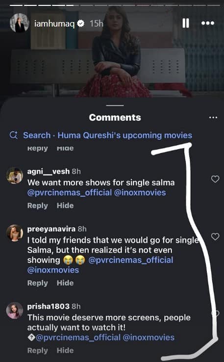 हुमा की इस पोस्ट ने सोशल मीडिया पर बड़ी चर्चा शुरू कर दी. देश के कई शहरों जैसे लखनऊ, पटना, दिल्ली और कोलकाता के फैंस ने उनकी बात का समर्थन किया. लोगों ने थिएटर मालिकों से अपील की कि 'सिंगल सलमा' के शो बढ़ाए जाएं ताकि ज्यादा दर्शक इसे देख सकें. कई दर्शकों ने अपने टिकट बुकिंग ऐप्स के स्क्रीनशॉट शेयर किए, जिनमें दिख रहा है कि फिल्म के शो या तो हाउसफुल हैं या उपलब्ध ही नहीं. इससे साफ है कि लोग फिल्म देखना चाहते हैं, लेकिन स्क्रीन की कमी के कारण मौका नहीं मिल पा रहा.