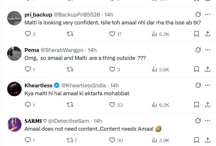 मालती और अमाल के इस वीडियो के बाद से दोनों के रिलेशनशिप को लेकर चर्चा हो रही है. यूजर्स को लग रहा है कि शायद मालती और अमाल एक-दूसरे के साथ रिश्ते में थे. एक यूजर ने लिखा- मालती बहुत कॉन्फिडेंट लग रही हैं. इसीलिए तो अमाल अभी तक नहीं डर रहा था इससे? वहीं दूसरे यूजर ने लिखा- क्या, तो अमाल और मालती बाहर जानते थे? वहीं एक यूजर ने लिखा- क्या मालती ही है अमाल की एक तरफा मोहब्बत. वहीं एक यूजर ने लिखा- अमाल को कंटेंट की जरुरत नहीं है. कंटेंट को अमाल की जरुरत है.
